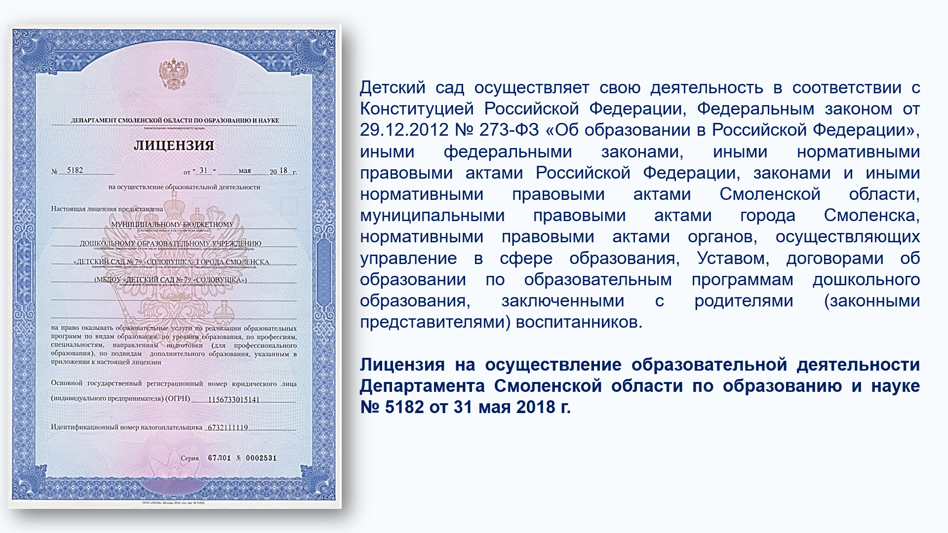 Детский сад функционирует с 2015 года. Лицензия на осуществление образовательной деятельности: серия 16 Л 01 № 0003179 выдана Министерством образования Республики Татарстан 02.10.2015 г.