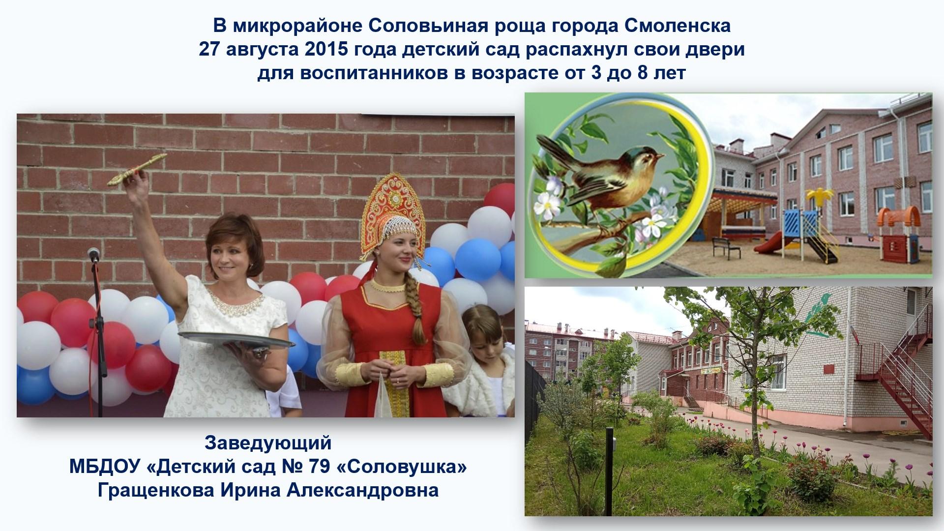 Муниципальное бюджетное дошкольное образовательное учреждение «Детский сад № 79 «Соловушка» города Смоленска функционирует с 2015 года. Сегодня каждое утро детский сад встречает более 200 ребят в возрасте от 3 до 8 лет.